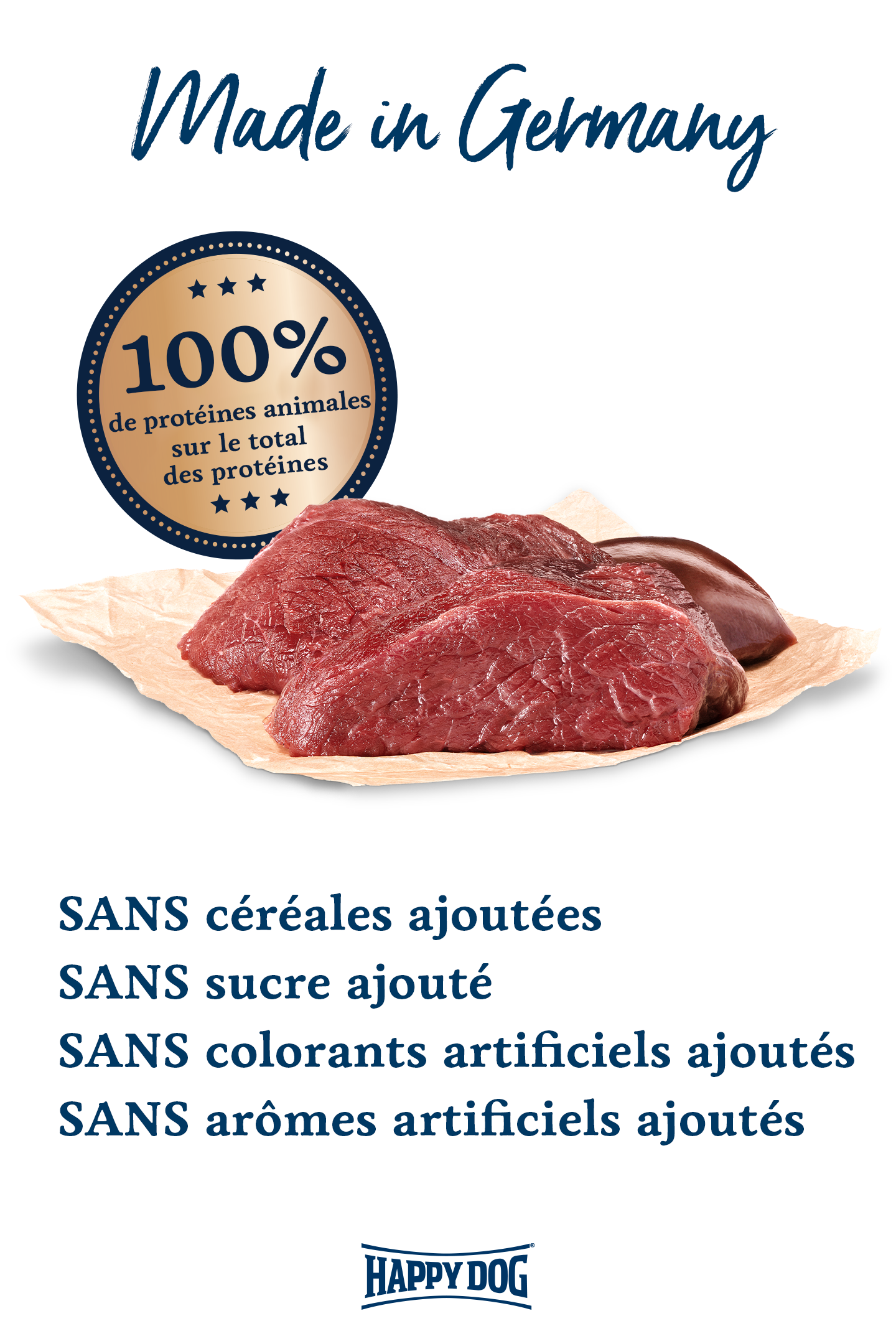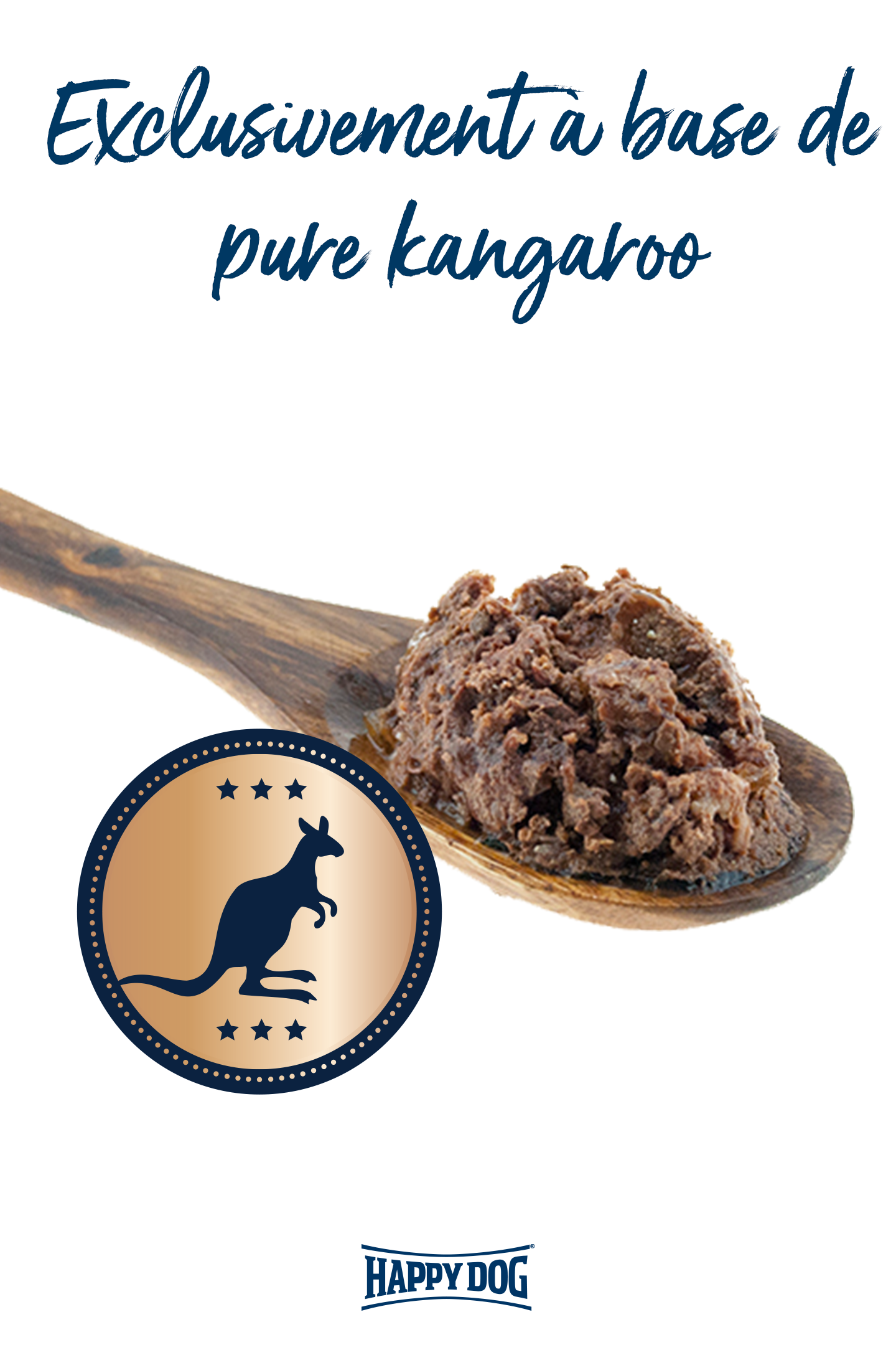 L’aliment humide Happy Dog 100 % Kangourou apporte la nature dans sa gamelle. Nos aliments humides à base de viande de qualité supérieure sont composés à 100 % de viande et d'abats précieux tels que cœur, poumon et foie et contient des vitamines et des minéraux importants. La viande et les abats proviennent exclusivement du kangourou*. Notre alimentation humide est produite sans soja ni autres a additifs végétaux.