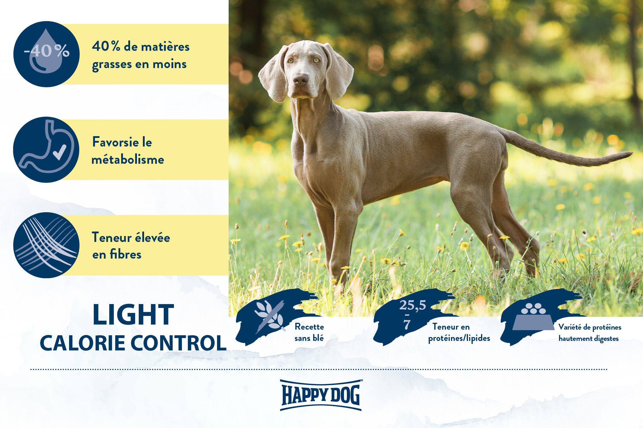 Happy Dog fit & vital Light Calorie Control est parfaitement adapté aux besoins des chiens qui ont besoin d'une alimentation faible en graisses, afin de maintenir une bonne constitution physique et de maintenir leur poids de forme, par ex. après un régime. Ce délicieux aliment complet, sans céréales avec seulement 7 % de matières grasses et de la L-carnitine qui favorise le métabolisme est basé sur le concept exclusif Happy Dog Natural Life Concept® . En raison de la teneur élevée en fibres, cet aliment sec est particulièrement rassasiant.