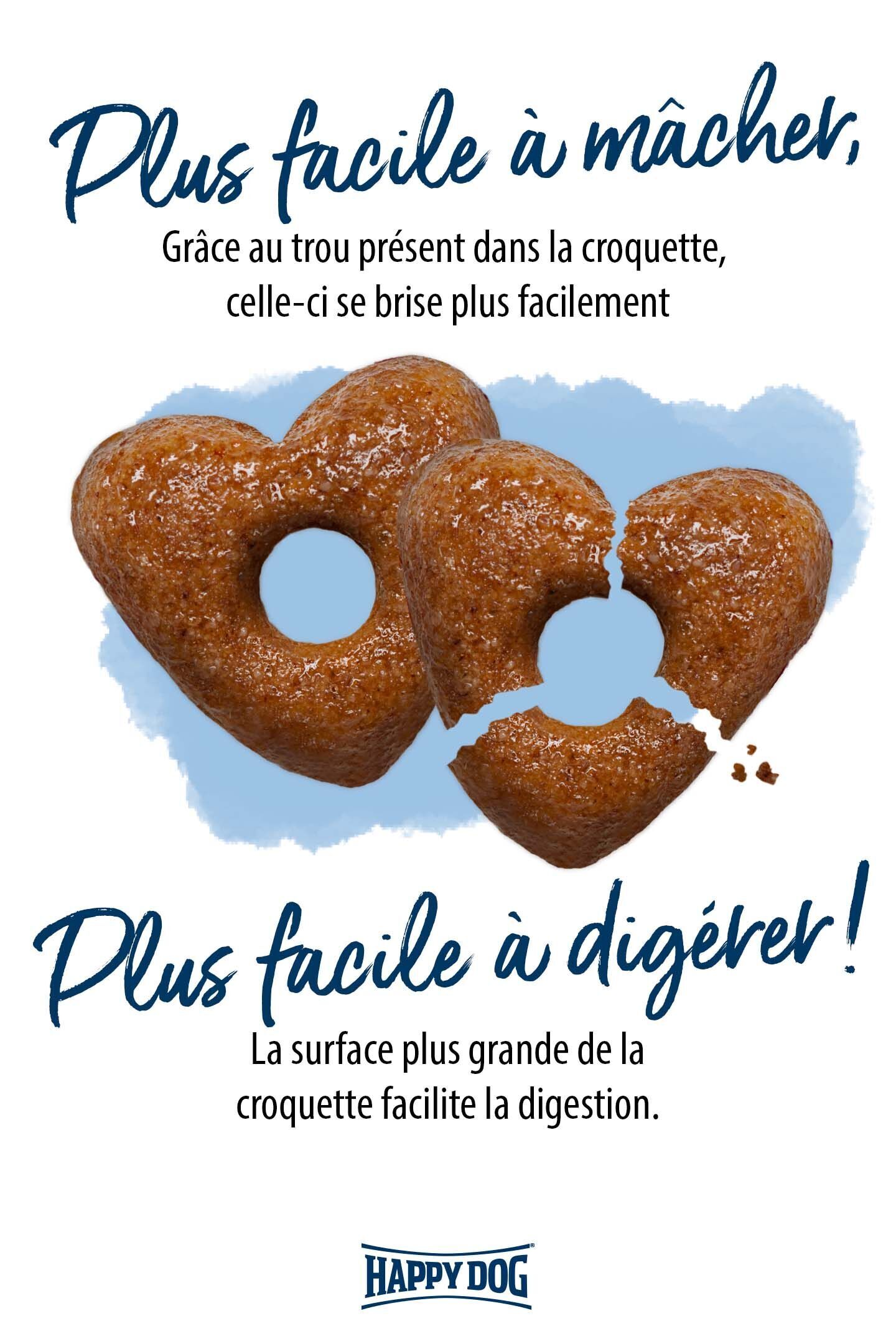 Nos croquettes pour chiot sont en forme de cœur avec un trou au milieu, cela permet à votre chiot peut croquer plus facilement les croquettes et mieux les mâcher. La surface plus étendue permet aux sucs gastriques de décomposer la nourriture de manière optimale. Cela favorise une bonne digestion.