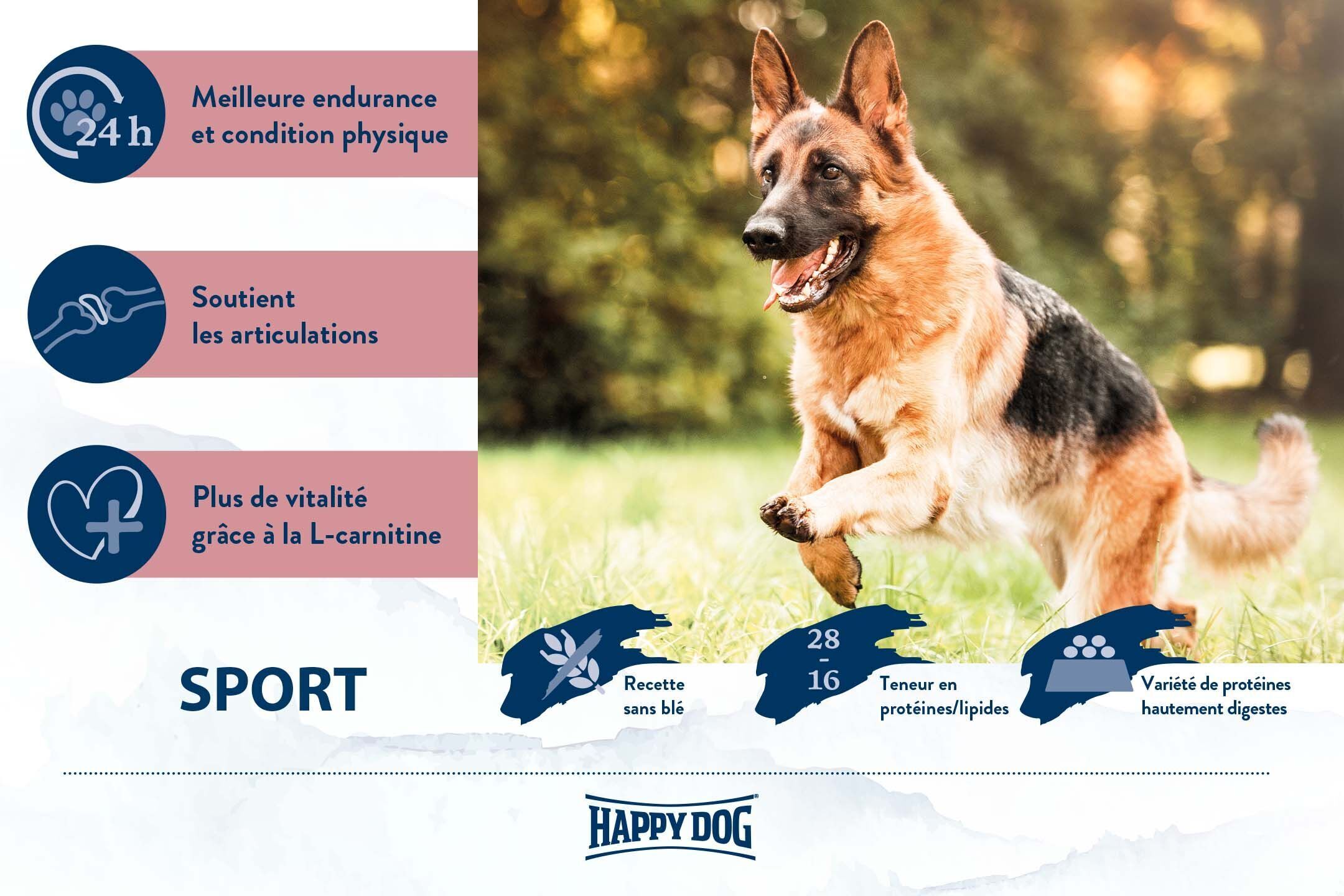 Happy Dog fit & vital Sport est parfaitement adapté aux besoins des chiens actifs dans le domaine du sport et de la performance. Basés sur le concept unique Happy Dog Natural Life Concept®, les ingrédients particulièrement bien tolérés, la L-carnitine et les précieuses moules de Nouvelle-Zélande ont un effet bénéfique sur la préparation à l'effort et le système musculo-squelettique. Cette recette à haute teneur énergétique et sans céréales garantit une endurance et une condition physique optimales et est donc idéale pour les chiens ayant un niveau d'activité élevé et actifs dans le domaine du sport.