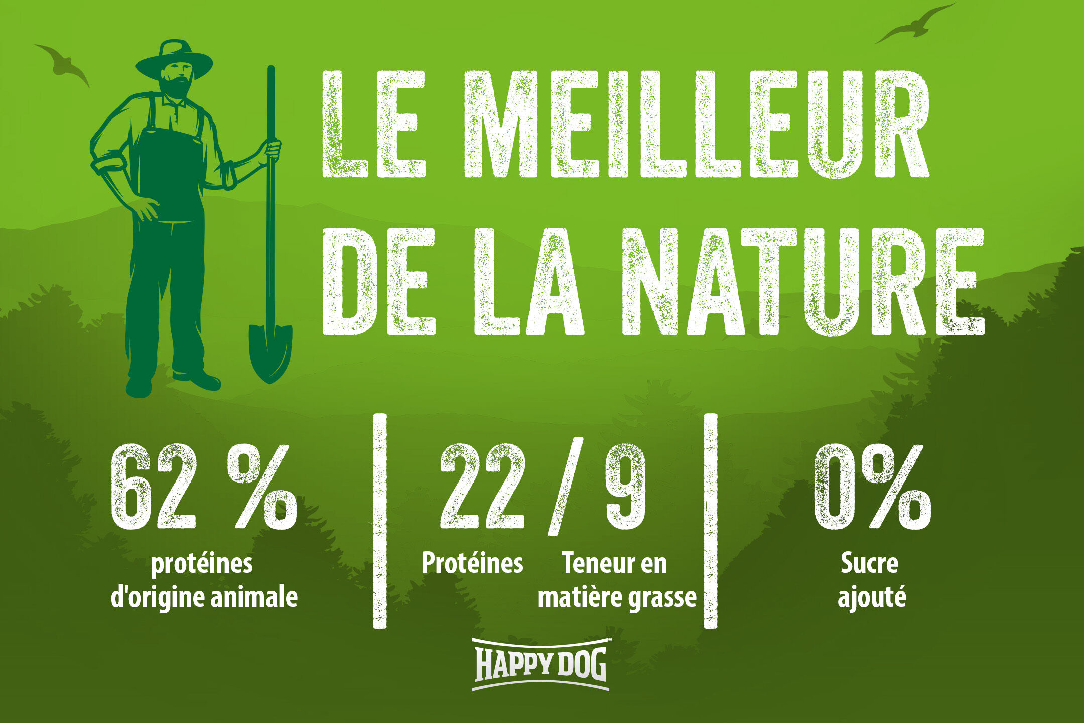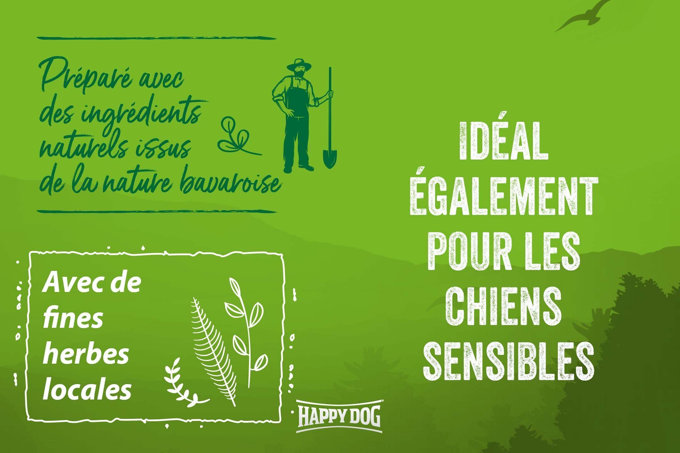 Votre chien a-t-il un tractus gastro-intestinal sensible ? Alors il appréciera Happy Dog NaturCroq Agneau et Riz, l'aliment complet très digeste composé des meilleurs ingrédients naturels issus de la Bavière. Ces délicieuses croquettes dures ne contiennent que des ingrédients de haute qualité, tels que de l'agneau facile à digérer, du riz très bien toléré et de saines céréales complètes issues de la région. La viande d'agneau fournit à votre chien des protéines animales de haute qualité et le riz est une source de glucides très bien tolérée par l'estomac et les intestins. Les céréales complètes fournissent des fibres alimentaires essentielles, et aident à réguler l'activité intestinale, rassasient, facilitent la digestion et contribuent à la bonne santé intestinale. Elles fournissent également de nombreuses vitamines B, des minéraux tels que le magnésium, le fer, le sélénium et le zinc et regorgent de glucides complexes. Cette délicieuse recette contient également de précieuses herbes locales qui apportent à votre chien de nombreux nutriments essentiels de manière naturelle.
