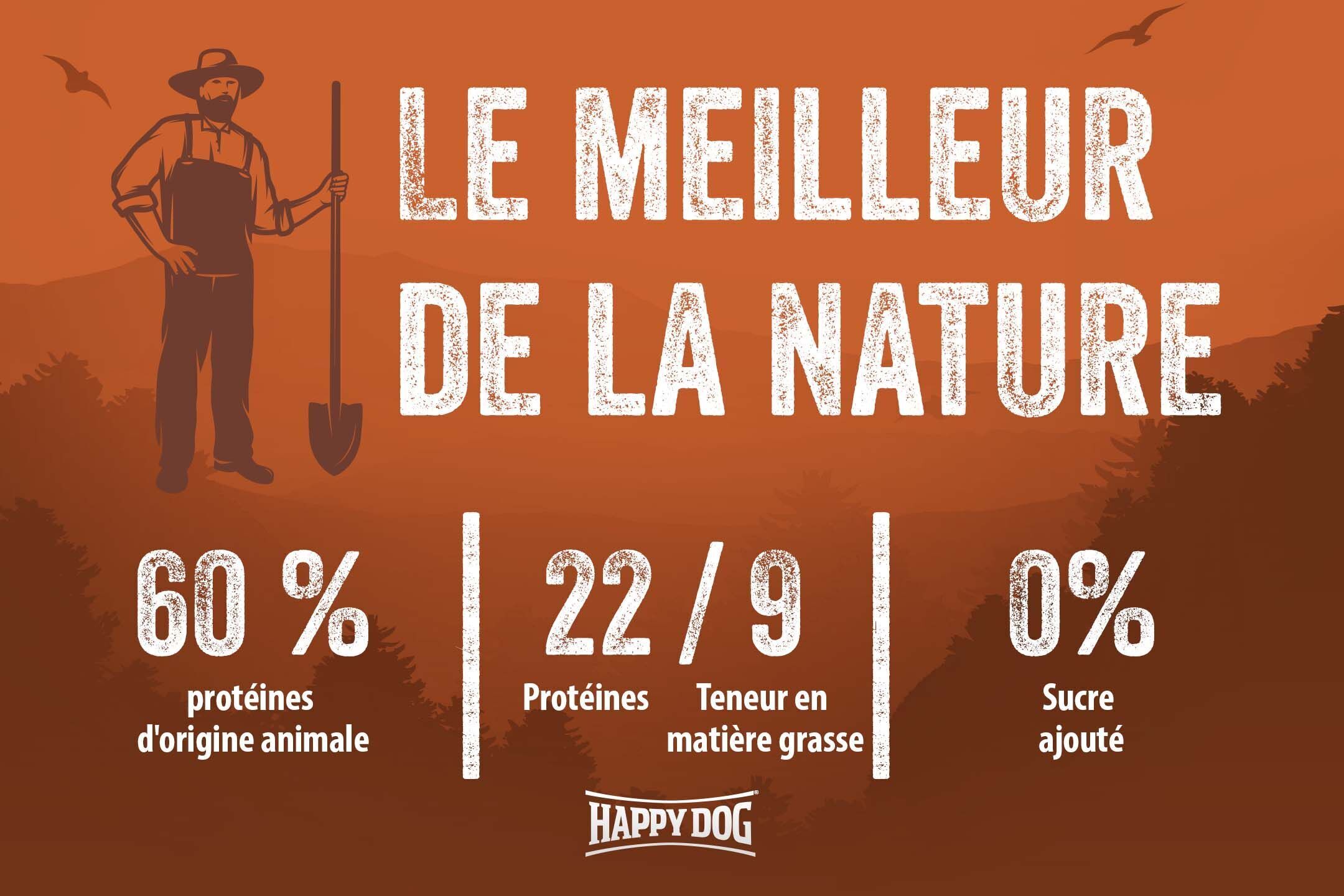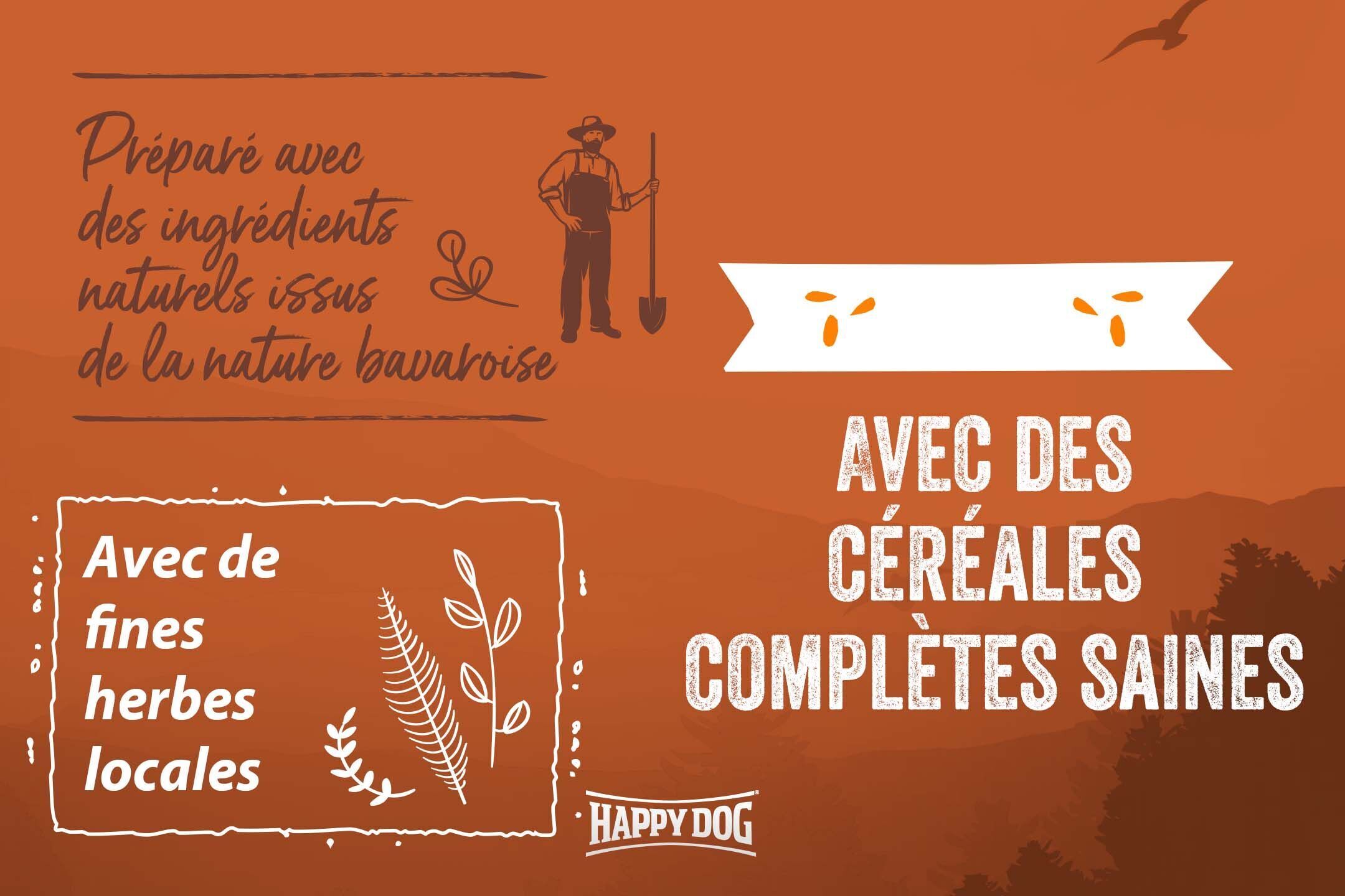 Happy Dog NaturCroq Bœuf et Riz est l'aliment sec idéal, au goût naturel de la Bavière. Ces croquettes croustillantes contiennent des ingrédients de haute qualité tels que de la viande de bœuf local, du riz très bien toléré et des céréales complètes issues de la région Bavaroise. La viande de bœuf apporte à votre chien des protéines animales de haute qualité et lui fournit l’énergie dont il a besoin pour jouer et courir. Les céréales complètes représentent d'importantes sources de fibres alimentaires. Elles favorisent la régulation de l'activité intestinale, rassasient et facilitent la digestion. Elles permettent également de renforcer la santé de l'intestin. De plus, les céréales complètes fournissent de nombreuses vitamines B, des minéraux tels que le magnésium, le fer, le sélénium et le zinc et regorgent de glucides complexes. Cette savoureuse recette saine contient également de précieuses herbes locales qui fournissent à votre chien de nombreux nutriments essentiels de manière naturelle.