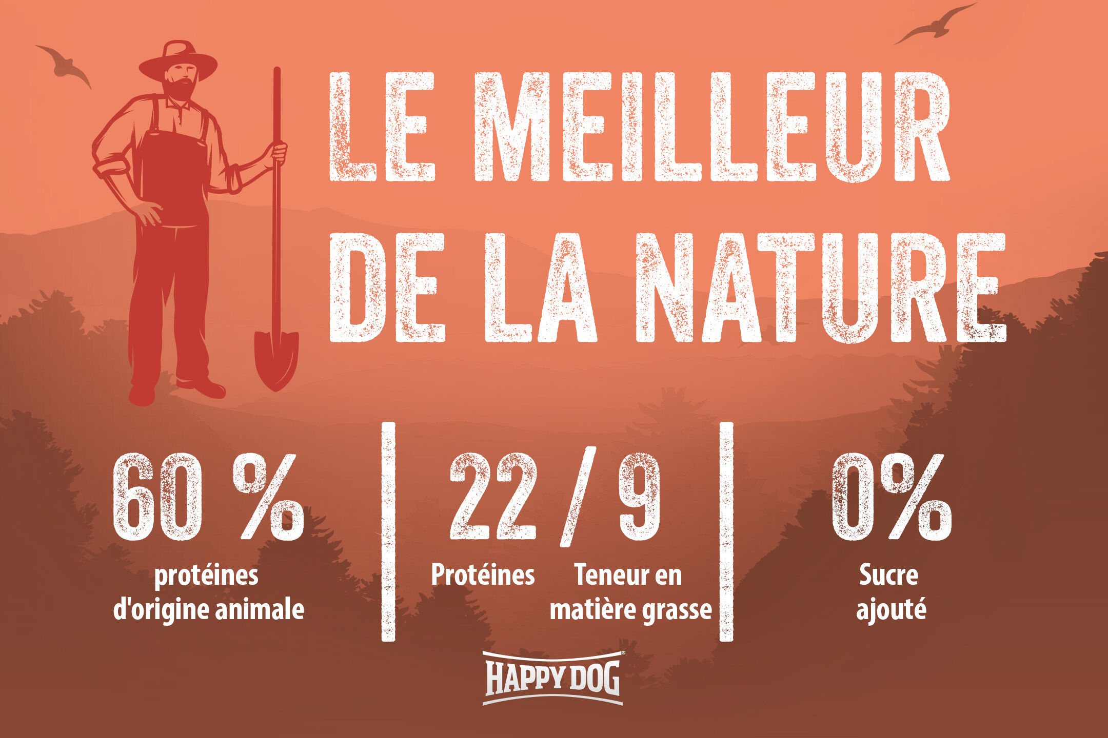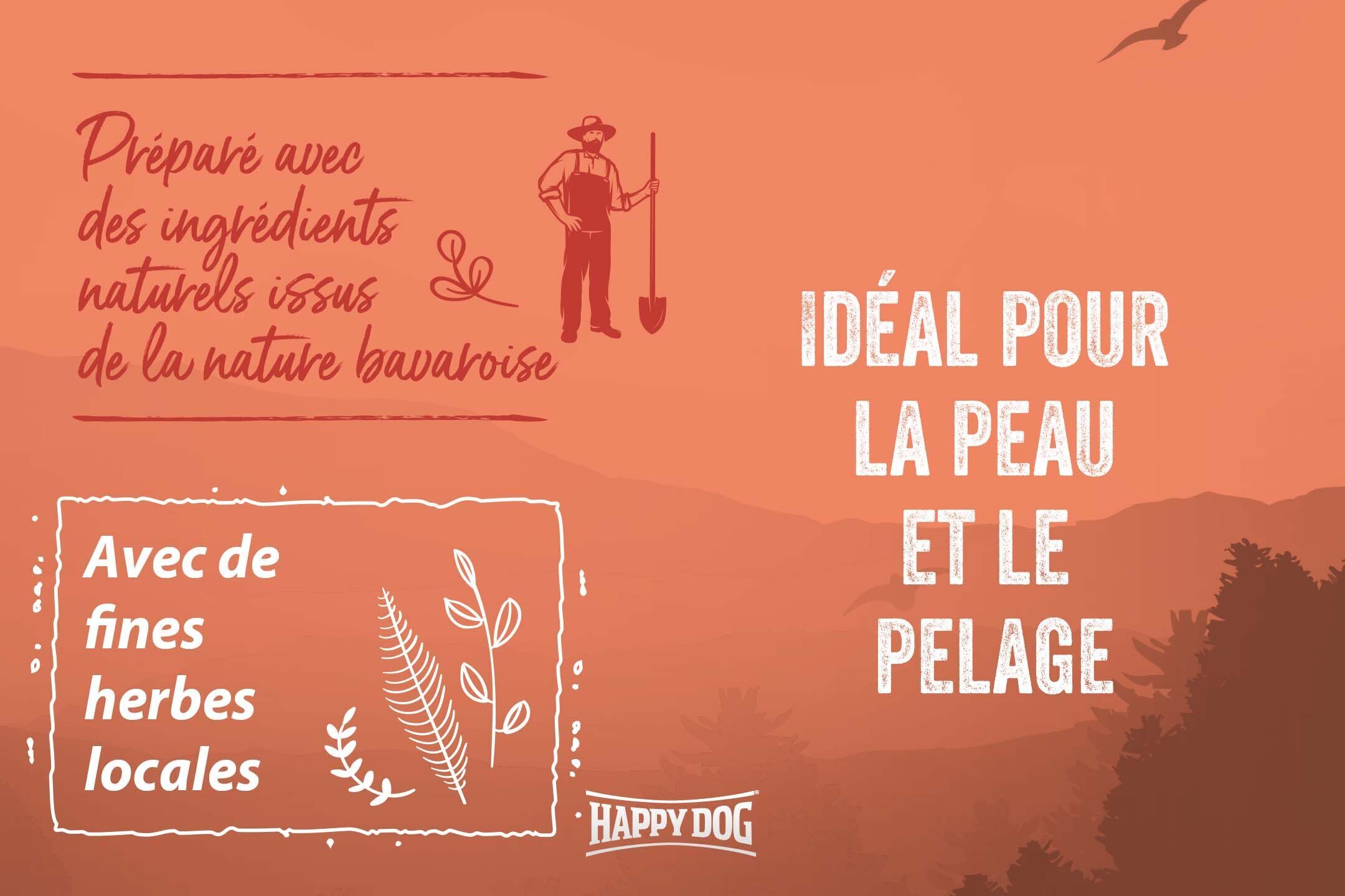 Votre chien a des problèmes cutanés récurrents, par exemple de peau et de pelage ? Les croquettes Happy Dog NaturCroq Saumon & Riz peuvent l’aider. Notre aliment complet, équilibré et digeste est composé des meilleurs ingrédients naturels issus de la région Bavaroise. Ces croquettes croustillantes contiennent des ingrédients de qualité supérieure, tels que du saumon nutritif, du riz très bien toléré et des céréales complètes saines et locales. Le saumon est riche en acides gras essentiels oméga-3 et oméga-6 qui protègent la peau et rendent le pelage brillant. Les céréales complètes régionales représentent d'importantes sources de fibres, qui favorisent la régulation de l'activité intestinale, rassasient, facilitent la digestion et contribuent de manière positive à la santé intestinale. Elles fournissent également de nombreuses vitamines B, des minéraux tels que le magnésium, le fer, le sélénium et le zinc et regorgent de glucides spécifiques. Cette recette extrêmement savoureuse contient également de précieuses herbes locales qui apportent à votre chien de nombreux nutriments essentiels de manière naturelle.