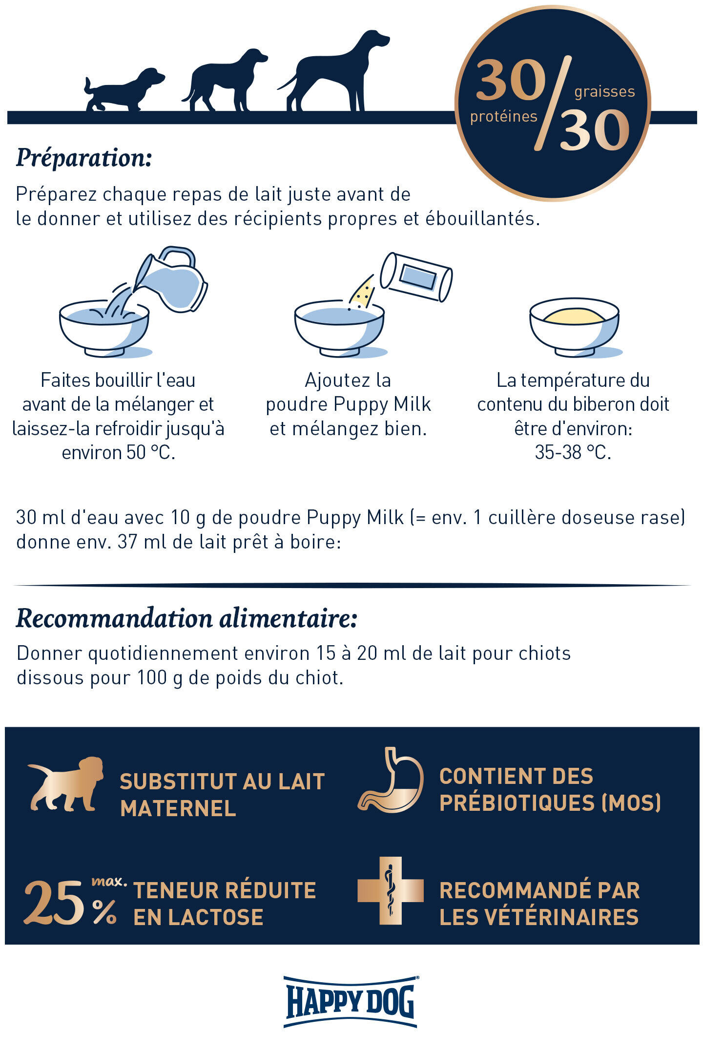 - 30 ml d'eau avec 10 g de poudre Puppy Milk (= env. 1 cuillère doseuse rase) donne env. 37 ml de lait prêt à boire.