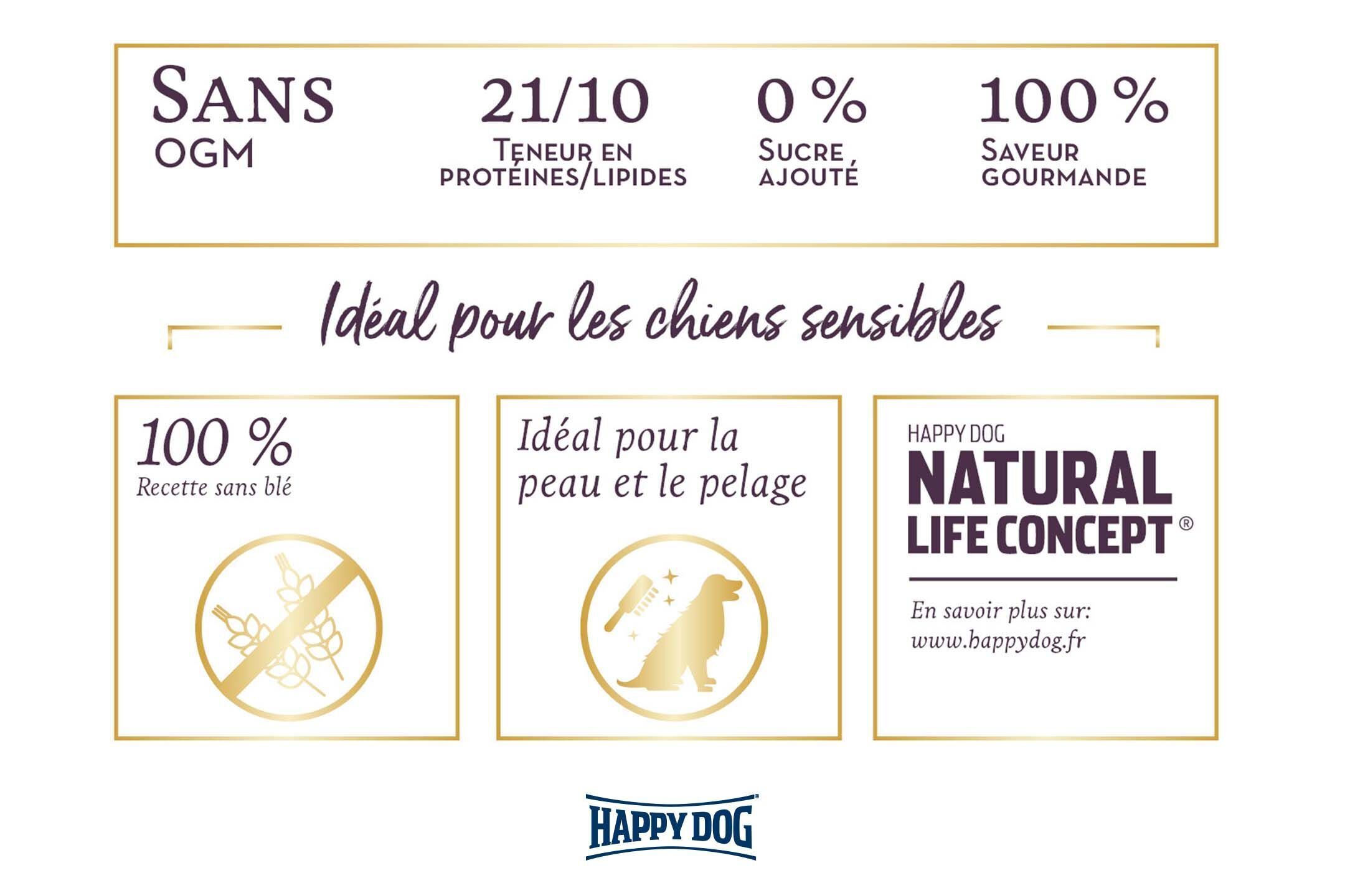 Cette recette savoureuse de Happy Dog Ireland est idéale pour nos amis à quatre pattes adultes et friands à partir de 11 kg.