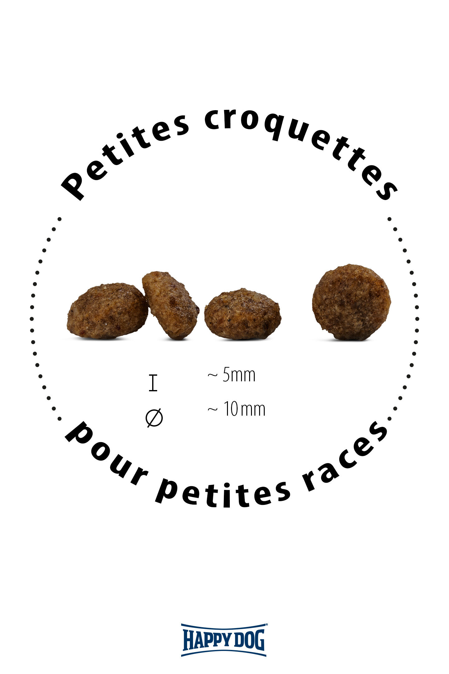 Idéalement, vous devriez donner à votre petit chiot les croquettes Happy Dog Sensible Mini Puppy à partir de la 4ème semaine de vie jusqu'à 12 mois inclus. Les petites races de chiens jusqu'à 10 kg (poids du chien adulte) atteignent plus rapidement leur maturité et ont une croissance plus régulière que les grandes races. C'est pourquoi nos aliments Mini Puppy sont spécifiquement formulés pour répondre aux besoins des chiots et des jeunes chiens de petites races. A partir du 13e mois, vous pourrez progressivement passer à un aliment Mini Adult. Pour une recette similaire aux croquettes Sensible Mini Puppy Agneau & Riz, nous vous recommandons Happy Dog Sensible Mini Neuseeland, une recette Agneau & Riz également, avec les apports adaptés pour l’âge adulte des chiens de petites races.