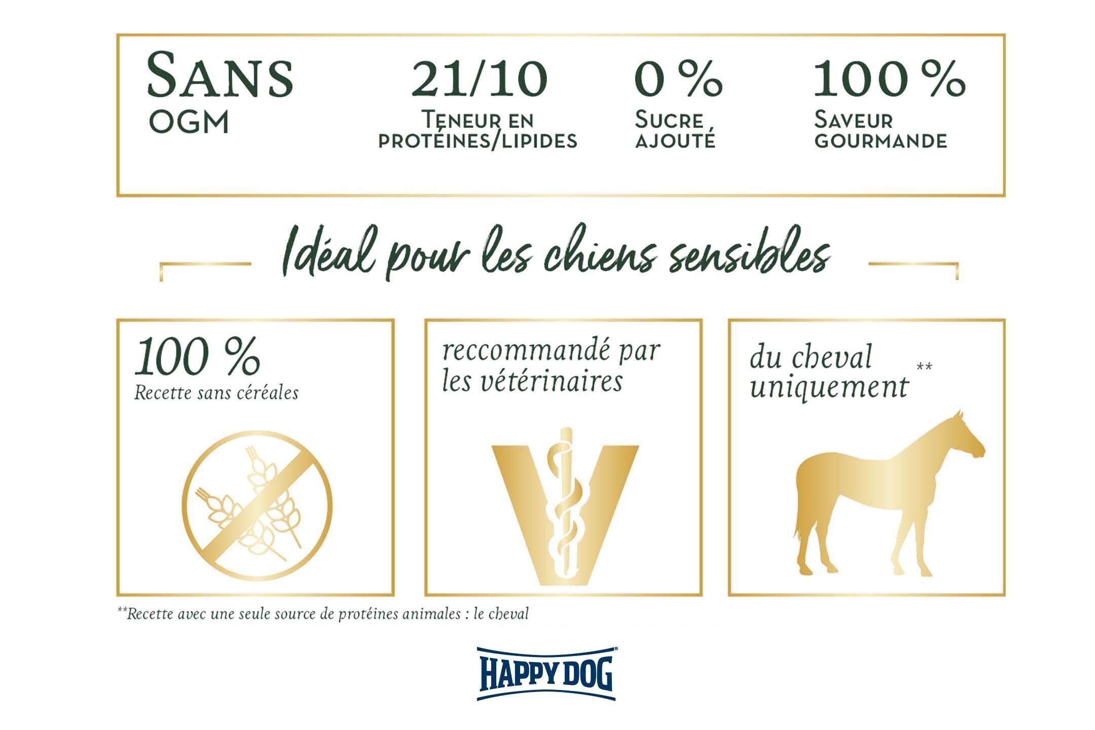Vous souhaitez chouchouter votre ami à quatre pattes avec un plat spécifique ? Cela peut provenir d'une intolérance alimentaire.Ou bien votre chien présente une sensibilité alimentaire et est sujet à des problèmes digestifs ainsi qu'à des problèmes de peau et de pelage ? Cela peut provenir d'une intolérance alimentaire.Cela peut provenir d'une intolérance alimentaire. La viande de cheval comme seule source de protéines animales et les pommes de terre sans gluten font de Happy Dog Montana une véritable expérience gustative, même pour les amis à quatre pattes sensibles au niveau alimentaire. Les pommes de terre ne contiennent pas de gluten et conviennent donc aux animaux intolérants aux céréales. Le cheval en tant que source rare et exclusive de protéines est idéalement bien toléré. De précieux acides gras oméga-3 et oméga-6, essentiels pour une peau saine et un pelage brillant complètent cette recette unique. Cela fait de Supreme Sensible Montana un aliment sec équilibré, parfait pour les chiens souffrant d'allergies et d'intolérances alimentaires.
