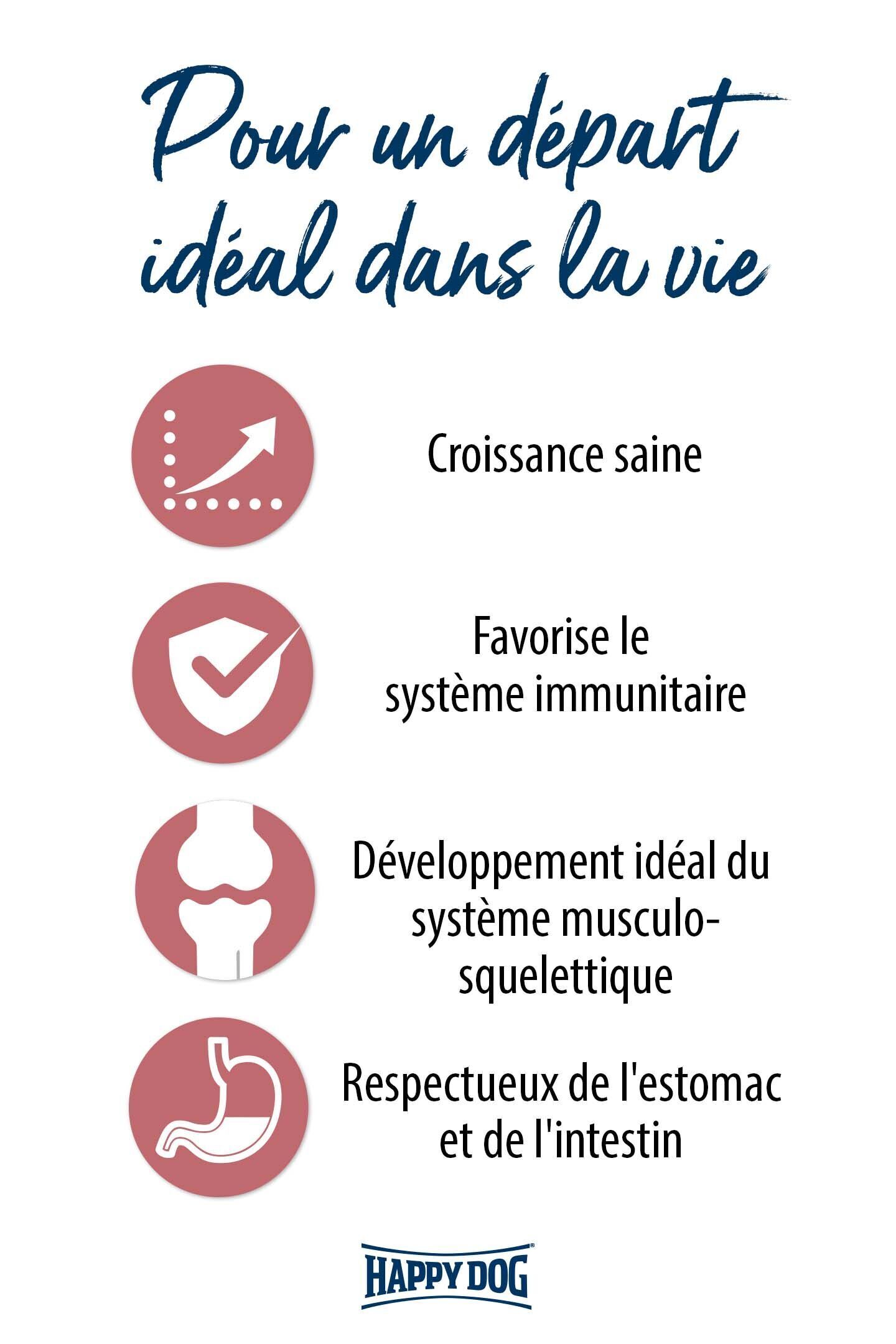 En tant que chiot, votre nouveau compagnon à 4 pattes a besoin d'une alimentation riche en nutriments pour lui assurer un apport idéal au cours de ses premiers mois de vie. En effet, du 1er au 6ème mois environ, votre petite boule de poils est dans sa phase de croissance principale. C'est pourquoi les croquettes Happy Dog sont particulièrement nutritives et riches, pour répondre à ces besoins durant cette période de croissance intensive.