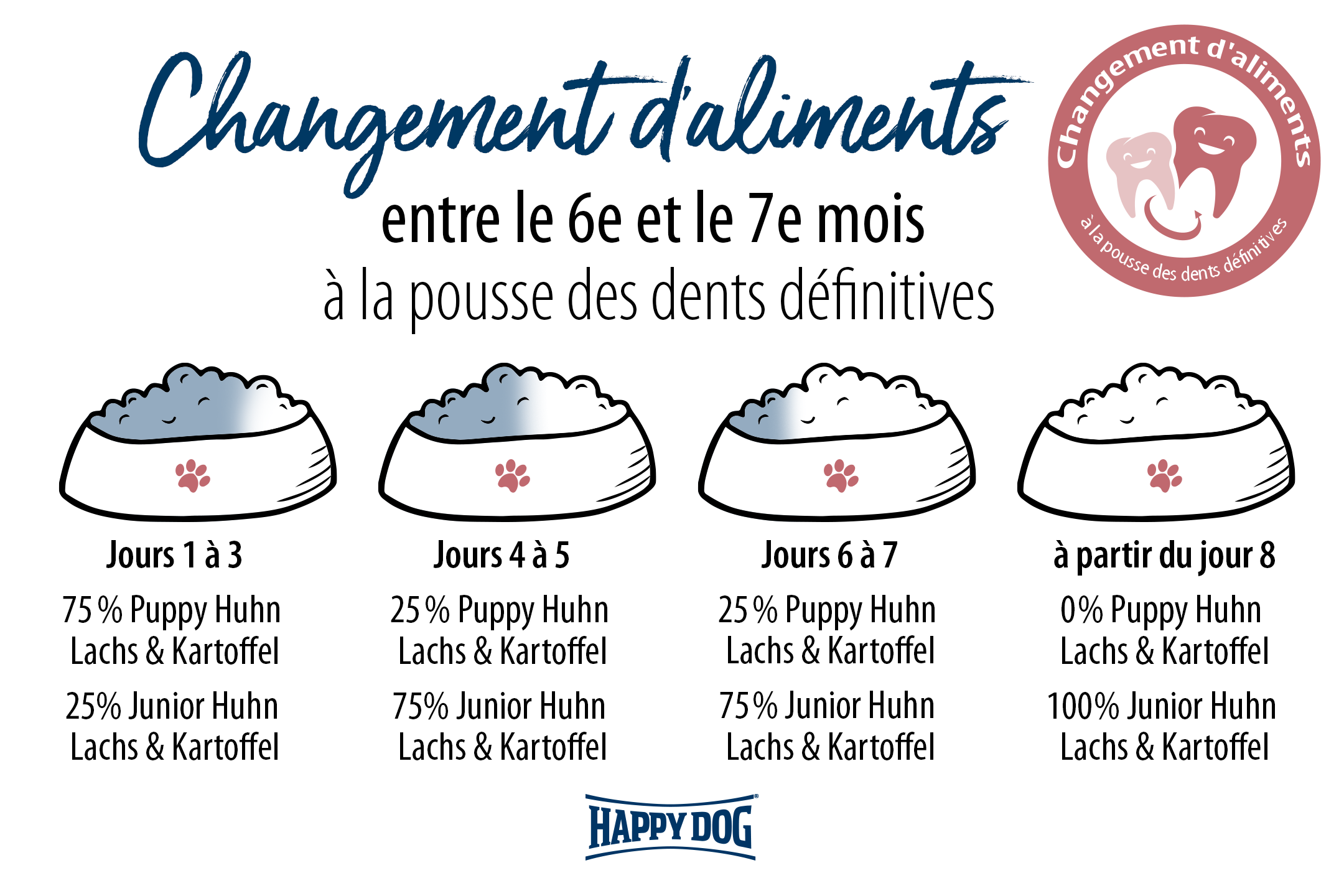 À partir de la 27ème semaine, passez progressivement à une nourriture pour chiens Junior, comme Happy Dog Sensible Junior Poulet, Saumon & Pomme de terre.