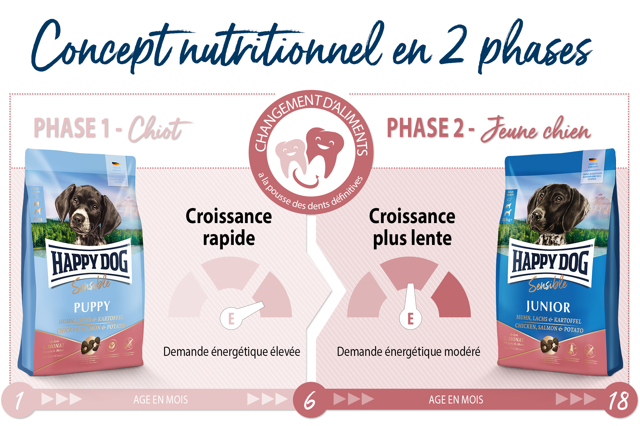 L'aliment complet Happy Dog Sensible Puppy au poulet, saumon & pomme de terre convient à votre chiot de la 4ème à la 27ème semaine de vie (fin du 6ème mois). Ensuite, vous devrez passer progressivement à un aliment adapté aux jeunes chiens, par exemple Happy Dog Sensible Junior Poulet, Saumon & Pomme de terre.