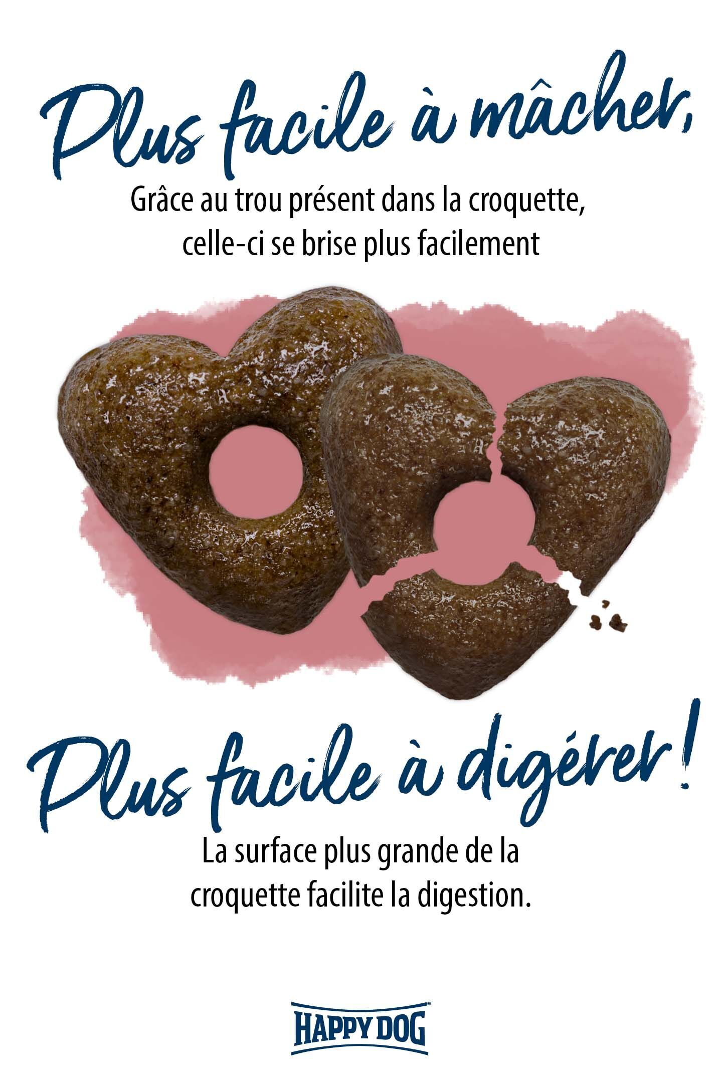 Le trou a deux avantages : La croquette se brise plus facilement et est plus facile à mâcher. De plus, les croquettes ont une surface plus importante et peuvent être décomposées et digérées plus facilement par l'estomac et les intestins. Les deux avantages combinés favorisent une bonne et saine digestion.