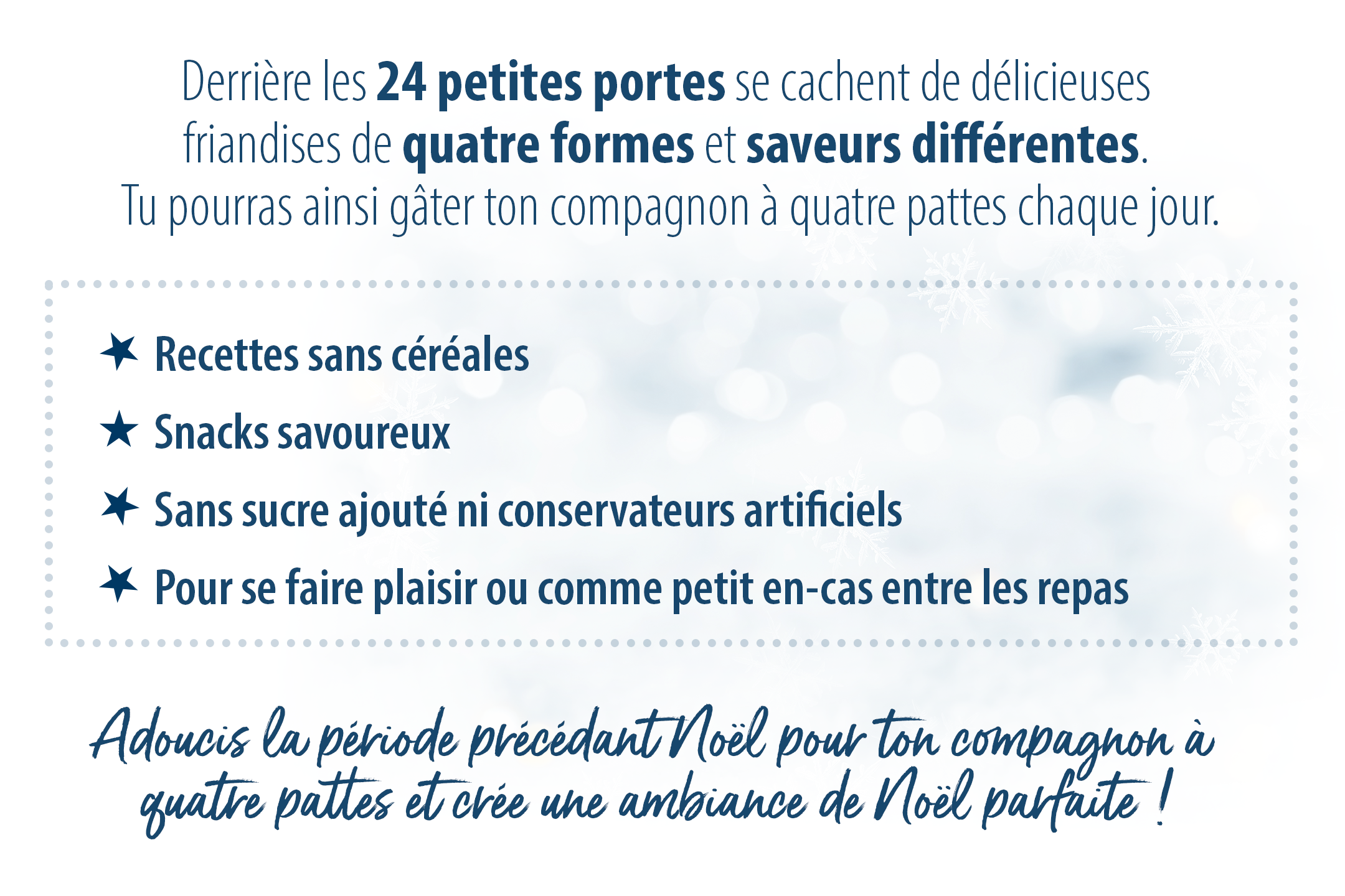 Transformez Noël en un moment de joie pour votre chien avec les Snacks du Calendrier de l'Avent Happy Dog. Faites de chaque jour une fête de délices et offrez à votre compagnon à quatre pattes des moments de plaisir inoubliables !