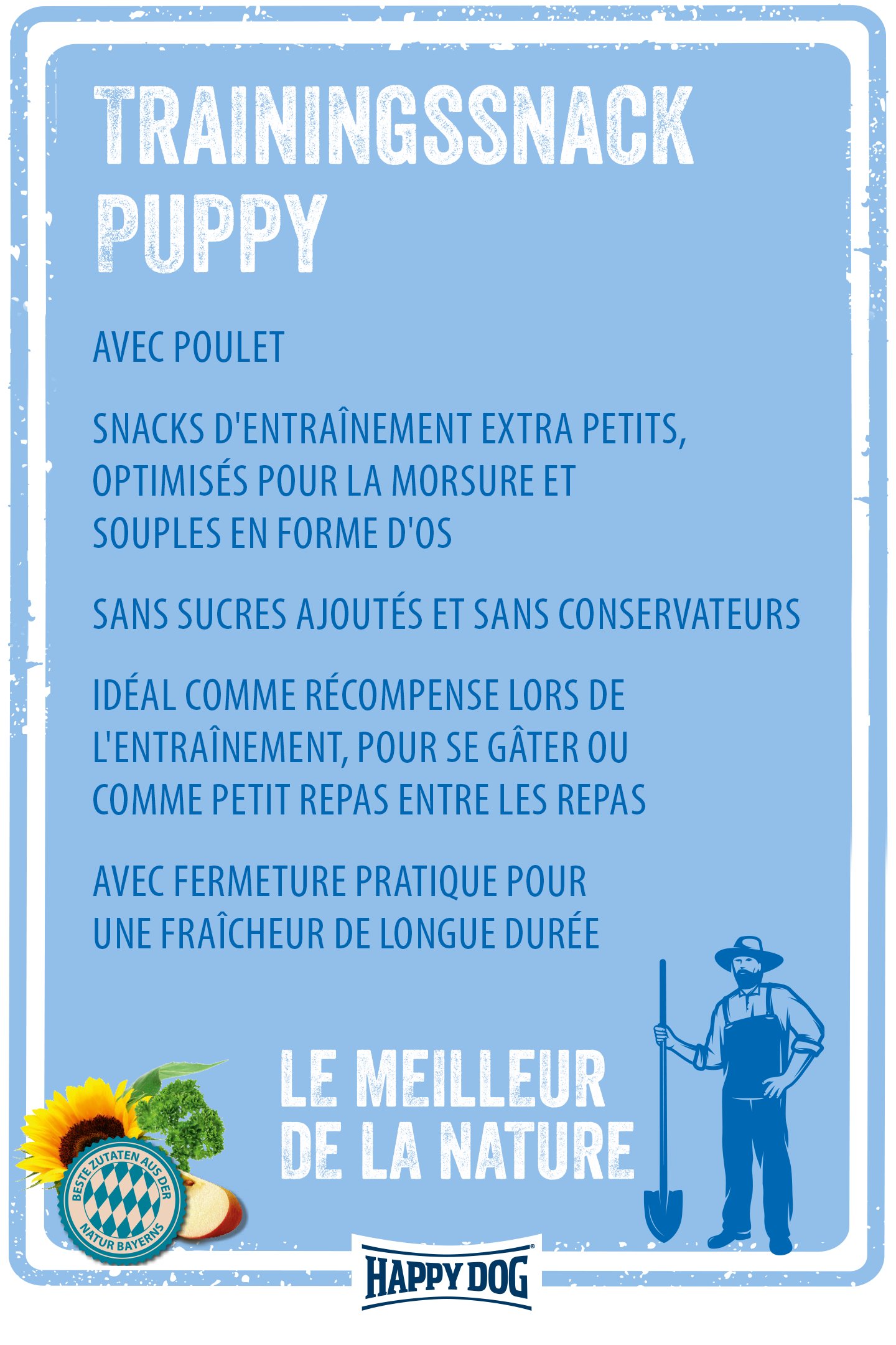 Vous avez adopté un petit chiot qui a bouleversé votre monde en un rien de temps ? Les chiots sont mignons et maladroits et vous allez certainement le regarder explorer pendant des heures. Mais après une courte période d'adaptation, il convient de commencer l'éducation et de récompenser votre petit chien pour les comportements positifs et les exercices réussis. Nos friandises Happy Dog NaturCroq Mini Puppy sont faites pour cela. Avec ces friandises pour chiots faciles à digérer comme récompense, votre petit chien apprendra rapidement ses premières leçons.