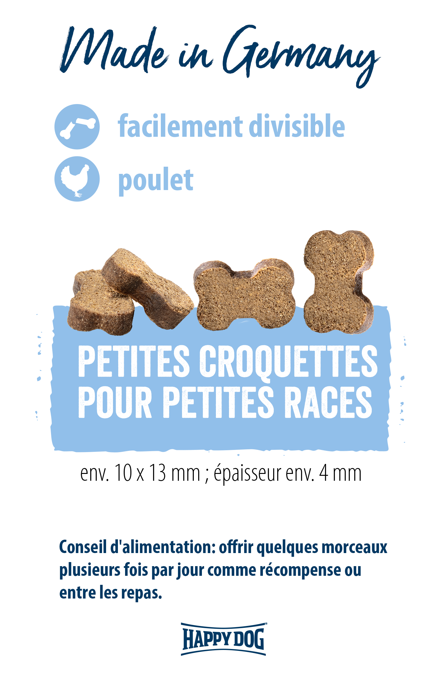 Les tendres friandises de dressage au poulet et au riz, faciles à digérer, sont facilement divisibles grâce à leur forme en os et conviennent donc très bien aux petits chiens à partir de leur 6e semaine de vie. Pour que votre petit chiot ne manque pas de variété, même pendant les séances d’éducation, nous avons élaboré cette friandise facile à digérer. Un excellent stimulant pour l'entraînement avec de nombreux moments de plaisir gustatif garantis.