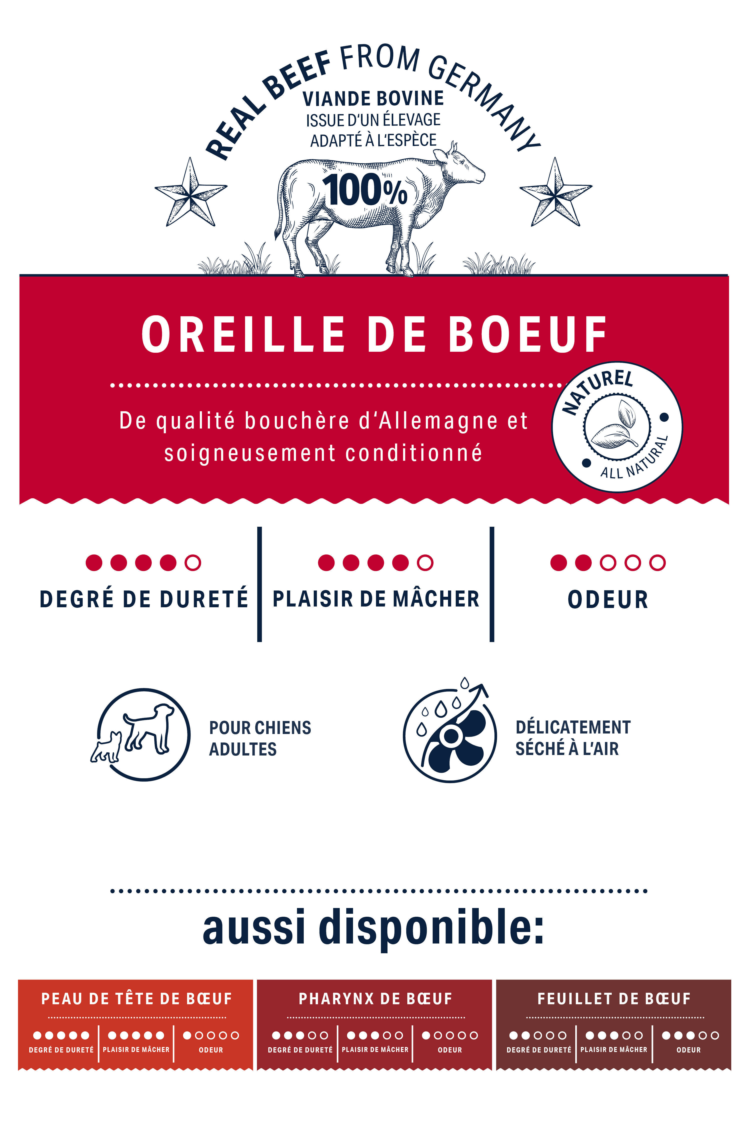 Les oreilles de bœuf se caractérisent par une faible teneur en matières grasses mais une forte teneur en protéines et sont bien tolérées. Le snack provient de bovins issus d'un élevage respectueux de l'espèce, il est naturellement sans céréales, sans sucre et séché en douceur sans conservateurs.